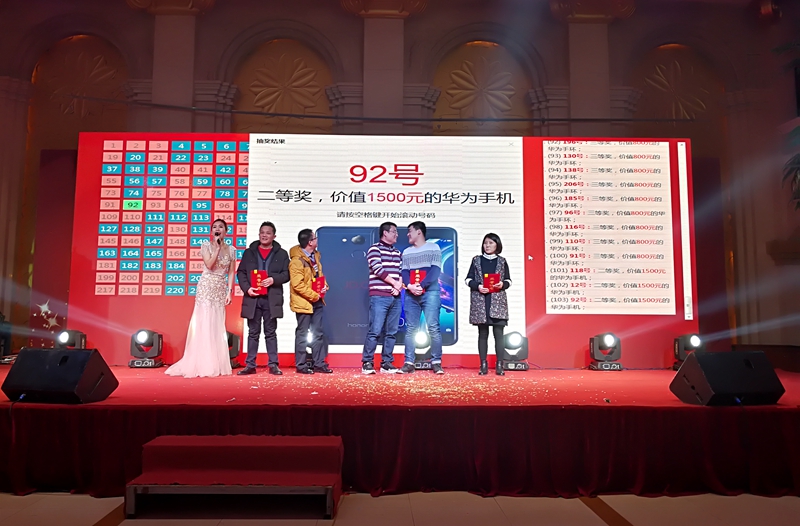 在總經(jīng)理的帶領(lǐng)下,冠能公司很多同事成了“花粉”,也就是華為的粉絲。2017年年會主題,就是借用的華為公司任總的話“不破樓蘭終不還”。我們也一直弘揚(yáng)類似華為的奮斗者文化,讓跟隨公司共同奮斗發(fā)展的員工,有一個(gè)獲得認(rèn)可的回報(bào)。奮斗者不一定成功,但成功者必定奮斗過,我們將繼續(xù)努力奮斗。在這幾年年會里,用于抽獎(jiǎng)的獎(jiǎng)品大部分都是華為產(chǎn)品。今年特等獎(jiǎng)是5臺彩色電視機(jī),一等獎(jiǎng)是10臺華為PAD,二等獎(jiǎng)是20臺華為手機(jī),三等獎(jiǎng)是40臺華為手環(huán),四等獎(jiǎng)是60臺美的電火鍋。共計(jì)獎(jiǎng)品135臺。在此,再次恭喜得獎(jiǎng)的幸運(yùn)朋友。
