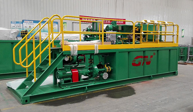 本套系統(tǒng)分為2個(gè)階段的固控處理和一套泥漿配置混合系統(tǒng)。鉆井泥漿初步分離采用的是冠能GNZS752型振動(dòng)篩,200GPM的處理能力、兩片篩網(wǎng)的構(gòu)造用來(lái)處理鉆井泥漿中的大顆粒的固體。振動(dòng)篩處理后的液體通過(guò)離心泵輸送給迷你型的沉降離心機(jī)GNLW223進(jìn)一步處理,可達(dá)3800RPM的轉(zhuǎn)速,分離的固體顆??蛇_(dá)到2個(gè)微米。