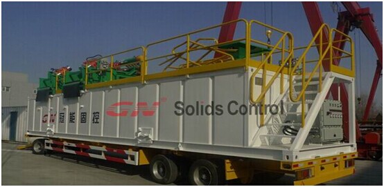 冠能150GPM泥漿系統(tǒng)配置如下 1、1臺GNZS703D雙層振動篩上安裝了3個4寸除泥旋流器,通過GNZS703D雙層篩可以把粗砂除去,然后通過除泥旋流器把20um左右以上的顆粒在分離除去, 2、2臺GNSB4X3-12J的砂泵安裝在泥漿罐斜倉上,1臺用于給除泥器供漿,另外1臺作為混漿泵使用。 3、4米長的泥漿罐,非常緊湊的設(shè)計(jì)跟合理的布局,對于狹小的鉆井空間非常適宜。
