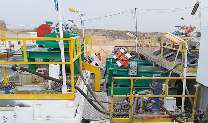 兩臺高G干燥篩放置于低高度的泥漿罐上面,在把整個干燥裝置放置于鉆機(jī)的振動篩下面。